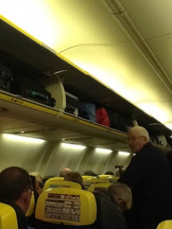 As virtually everyone had their hand luggage allowance there was a scramble for the overhead lockers. Now I never ever pay extra for reserving a seat - maybe if I was travelling with young children it would be different, but fortunately those days are long gone for me. I was somewhat shocked that we boarded the plane via a walkway, in particular following all the uproar between Mr O'Leary and Aena on the matter! Once inside what I did notice was that the overhead lockers above the emergency extra legroom seats, which you had to pay for, were closed. Then I saw that the attendant was saving them for those passengers sitting in the extra payment seats - I wonder if that happens on all Ryanair flights.
